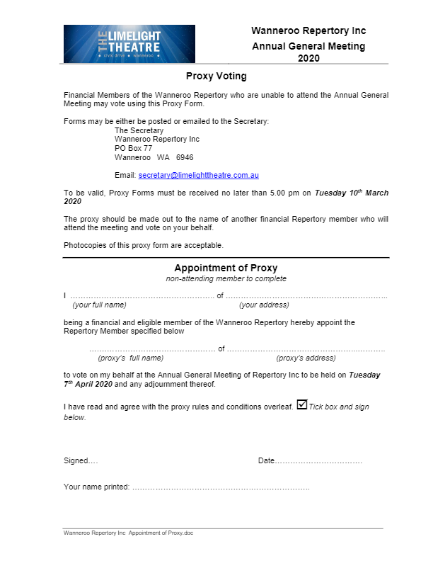 The Annual General Meeting of Wanneroo Repertory Inc will be held on 15th July 2020 at the Limelight Theatre